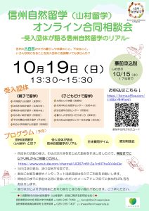 長野県発祥の山村留学を全国の児童・生徒及び保護者の皆様に広く知っていただき、関心を高めていただくため、県内受入団体と連携して「信州自然留学(山村留学)オンライン合同相談会」を開催します。